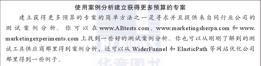 你往往需要為高級(jí)管理層建立一個(gè)案例,以獲得較高的預(yù)算,最好的辦法就是制作個(gè)簡(jiǎn)短的演示文稿供他們審核。為了使這個(gè)演示文稿達(dá)到最佳效果,它應(yīng)該強(qiáng)調(diào)使用測(cè)試工具在第一年中的預(yù)期投資回報(bào)率、潛在的高轉(zhuǎn)化率以及對(duì)高管來(lái)說(shuō)最重要的一一與轉(zhuǎn)化率提升相關(guān)的收入増長(zhǎng)(即使最基本的2%提提升,通通常也會(huì)給收入帶來(lái)很大的增長(zhǎng))。