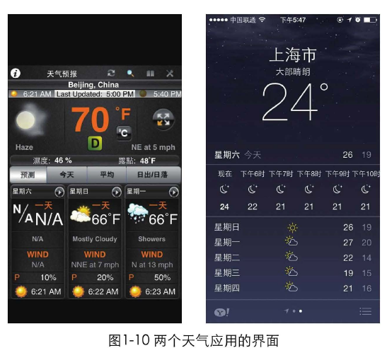 圖1-10是2個應(yīng)用的界面截圖。同樣是天氣預(yù)報的應(yīng)用,左邊的界面元素復(fù)雜,內(nèi)容雜亂,用戶很難快速獲取信息,而右邊的界面就清晰很多了。如果設(shè)計師都能長期關(guān)注設(shè)計趨勢、關(guān)注優(yōu)秀的設(shè)計是什么樣的,那左邊這樣的設(shè)計也許慢慢地就不復(fù)存在了。踩著巨人的肩膀,才能看得更遠(yuǎn)。