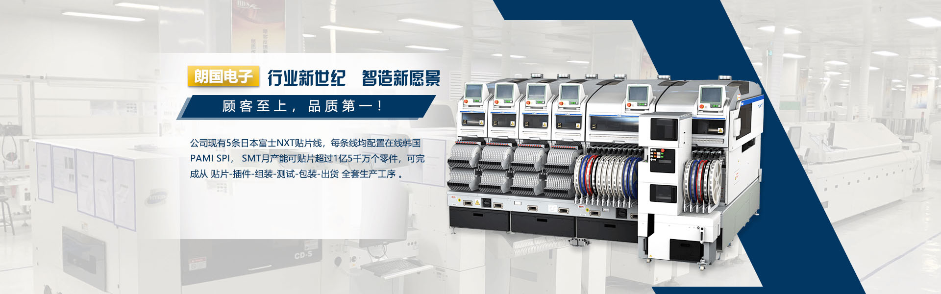 公司現(xiàn)有5條日本富士NXT貼片線,每條線均配置在線韓國PAMI SPI, SMT月產(chǎn)能可貼片超過1億5千萬個零件,可完成從 貼片-插件-組裝-測試-包裝-出貨 全套生產(chǎn)工序 。