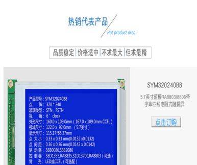 公司產(chǎn)品包括兩大系列:標準品和客戶定制品; 涉及:彩色TFT屏、單色圖形點陣、字符點陣、筆段式;涵蓋TN、HTN、STN、FSTN、TFT等多種模式;融合COG、TAB、COB、SMT等工藝形式。 代表產(chǎn)品5.7英寸320x240圖形點陣液晶屏可直接替代臺灣日本產(chǎn)相應產(chǎn)品。