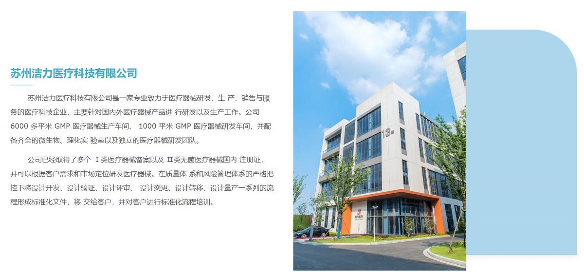 蘇州潔力醫(yī)療科技有限公司是一家專(zhuān)業(yè)致力于醫(yī)療器械研發(fā)、生 產(chǎn)、銷(xiāo)售與服務(wù)的醫(yī)療科技企業(yè),主要針對(duì)國(guó)內(nèi)外醫(yī)療器械產(chǎn)品進(jìn) 行研發(fā)以及生產(chǎn)工作。公司 6000 多平米 GMP 醫(yī)療器械生產(chǎn)車(chē)間、 1000 平米 GMP 醫(yī)療器械研發(fā)車(chē)間,并配備齊全的微生物、理化實(shí) 驗(yàn)室以及獨(dú)立的醫(yī)療器械研發(fā)團(tuán)隊(duì)。